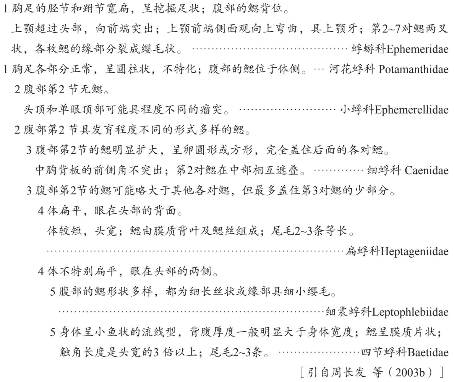 蜉蝣(Ephemeroptera)稚虫在河流中广泛分布,特别是清洁河段,由于这个类群对污染较为敏感,常作为水环境变化的指示种(童晓立,1995;王备新 等,2001)。蜉蝣生活史包括4个阶段,即卵、稚虫、亚成虫和成虫。其中稚虫生活期最长,在实际工作中,稚虫最容易采到,应用也最广,特别是水质监测中经常用到(周长发 等,2003)。另外,由于各种蜉蝣有相对严格的栖境选择,一条河流中蜉蝣类群的组成还能很好地反映河流栖境的多样性程度;河流生态系统受到破坏,生境单一,会造成大量蜉蝣种类的缺失。常见类群有四节蜉科(Baetidae)、小蜉科(Ephemerellidae)、扁蜉科(Heptageniidae)、细裳蜉科(Leptophlebiidae)、蜉蝣科(Ephemeridae)等。下面简略介绍几个常见类群。