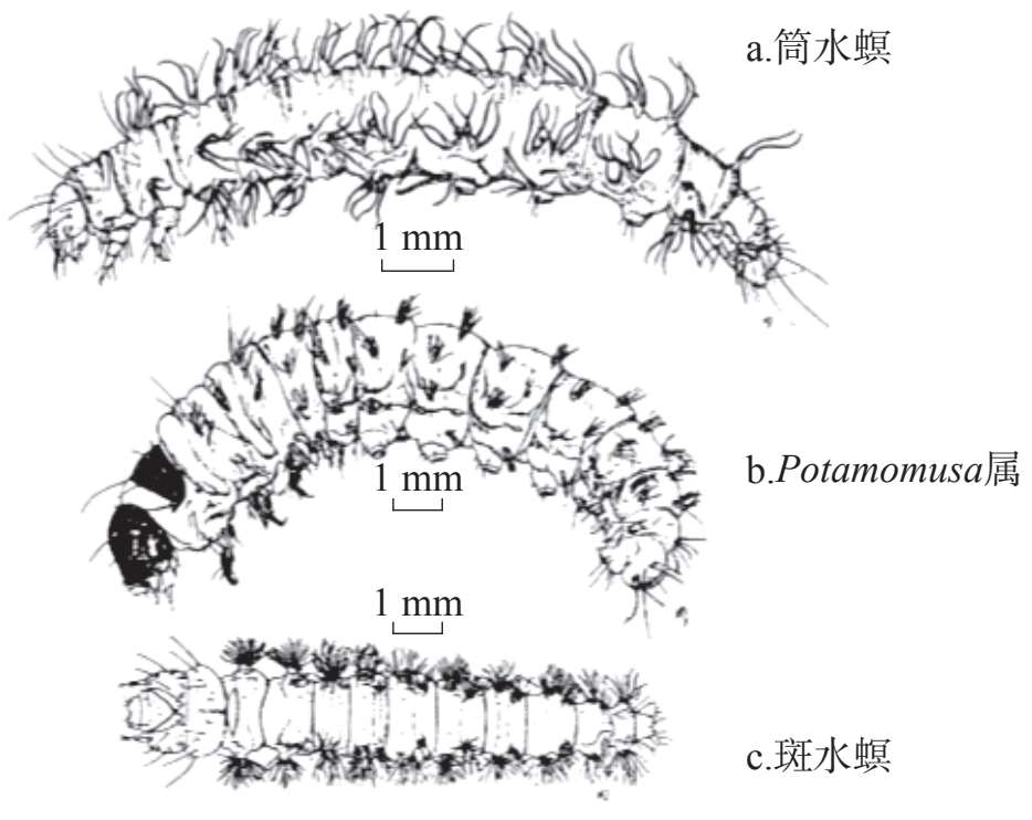 鳞翅目(Lepidoptera)营水生的类群主要是水螟亚科(Nymphulinae)的种类,其多数幼虫(图2-10)集群生活于寄主附近,以维管植物为食,或以微小植物及其底质为食(Morse et al.,1994)。水螟是许多湿地生态系统的重要成员,常分布于河流的浅滩和水草丰富区域,或激流的岩缝间。水螟的幼虫常生活于丝织的网中,丝网又与植物叶片或碎片相连成管状或带状巢。幼虫主要鉴别特征:头的两侧通常各有6个单眼,这些单眼为黑点,无晶体。具气管鳃,气管鳃通常位于第2~3胸节和腹节上,少数也位于第1胸节。气管鳃丝状,单生或簇生,多不分枝。蛹为被蛹及无颚蛹,第2~4腹节有扩大的气孔(这为水螟所独有);蛹化伴生有丝织避水的茧。常见类群有 Nymphula 属、筒水螟属( Parapoynx )、 Potamomusa 属和斑水螟属( Eoophyla )。 Nymphula 属常栖息于静水河段中,通常摄食漂于水面上的水生植物叶片,有时也摄食沉水植物;体圆,无气管鳃,具有避水的结构。筒水螟也是栖息于静水河段;体圆形,2龄后具分支的气管鳃。 Potamomusa 属栖息于湍急的溪流中,以水中石块上的藻类为食,并以寄主植物编织巢;体圆形,有气管鳃,不分枝。斑水螟幼虫栖息于急流河水中的石块表面,但也出现于浅水中;以丝织片状扁巢生活;头和体扁平,胸部和腹部各节基部侧面的突起上生有羽状鳃;靠大而长的上颚以附生于石块上的藻类为食。