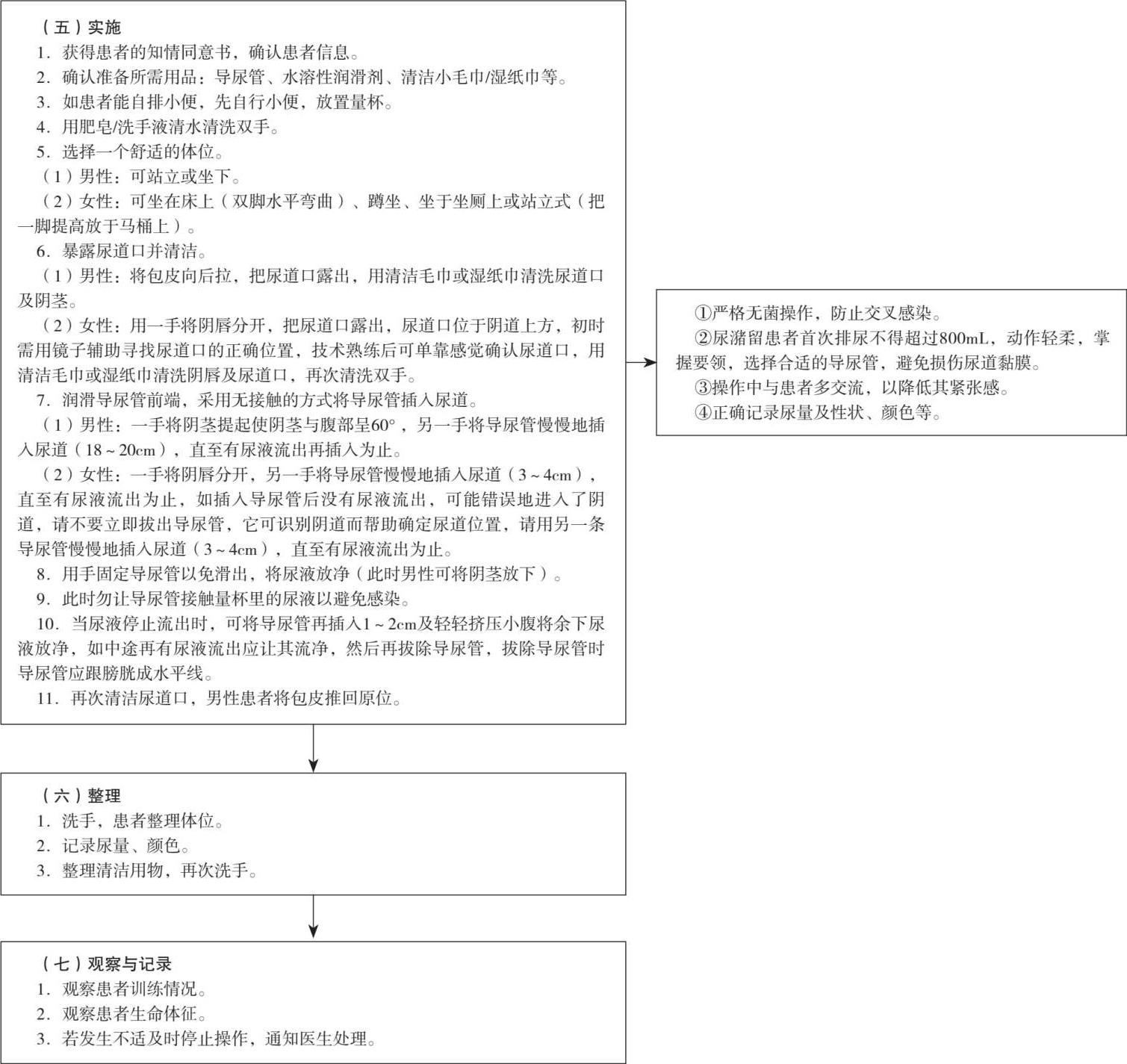 (2)间歇导尿频率依据两次导尿之间残余尿量和自行排出尿量而定,两次导尿之间能自行排尿100mL以上,残余尿量300mL以下,每日导尿4~6次;两次导尿之间能自行排尿200mL以上,残余尿量200mL以下,每日导尿4次;当残余尿量少于100mL或为膀胱容量20%以下时,可停止间歇导尿。