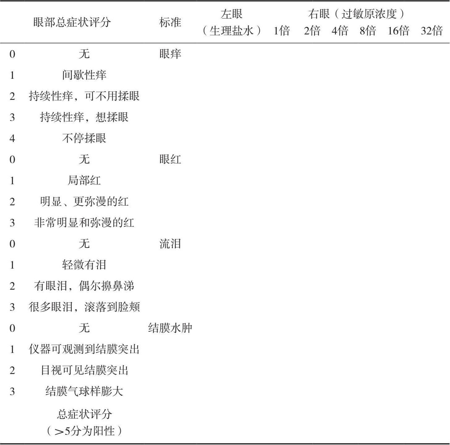 CAPT的阳性评价还没有一个国际标准,FDA推荐眼睛痒和红是阳性的标志(hallmarks),其他研究也提出眼痒、眼红、流泪、结膜水肿等4个指标,但眼痒和眼红仍然是评价CAPT阳性的首要指标。不是所有CAPT阳性的患者都出现流泪、结膜水肿或眼睑肿,因此可将其作为二级指标。痒是最主要的指标,通常在激发后3~5分钟内出现,痒可以按症状严重程度分级,分别给出1~4分,也有人使用视觉模拟评分法(visual analogue scale,VAS)评分。眼红或充血(hyperaemia)也是结膜反应的一级标志,在激发后5分钟出现,20分钟内达到峰值,30分钟后减退。因局部的减敏(desensitization),眼充血在重复CAPT时可能会减轻1%~3%。流泪和结膜水肿必须由专科医生评价打分,见下表。眼部总症状评分(total ocular symptoms score,TOSS)为0~13分,TOSS总分>5分为阳性,如果得分<5分,提高过敏原浓度再次激发直至阳性结果出现。CAPT也可能引起鼻部症状,建议试验中加入鼻部症状评分。日常门诊中,最好可以在每次激发前15分钟和激发后15分钟记录患者临床症状评分。也有研究使用简化的阳性评分标准,如眼痒0~4分,>2分为阳性;或者把痒和红一起出现当作阳性的标志。也有人在CAPT时使用数字成像技术,作为一个评价指标。