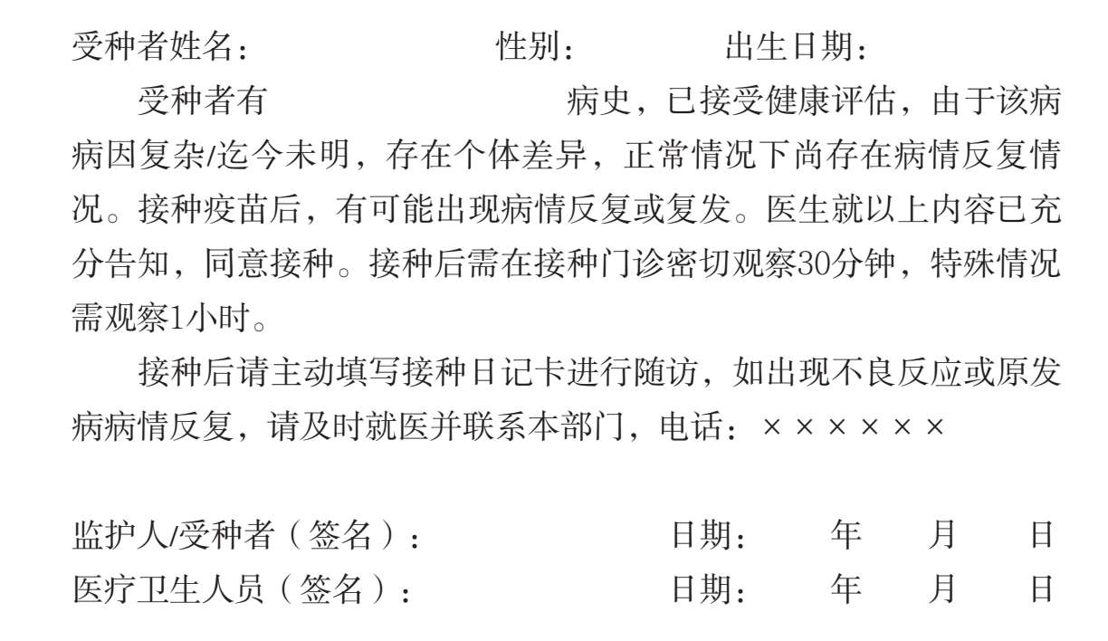 凭儿童疫苗接种评估报告单取号,候诊区等待叫号,登记医生在疫苗接种前进行健康询问、知情告知,签署疫苗接种知情告知书及特需人群接种补充知情告知书(图2-3),并打印预防接种单。