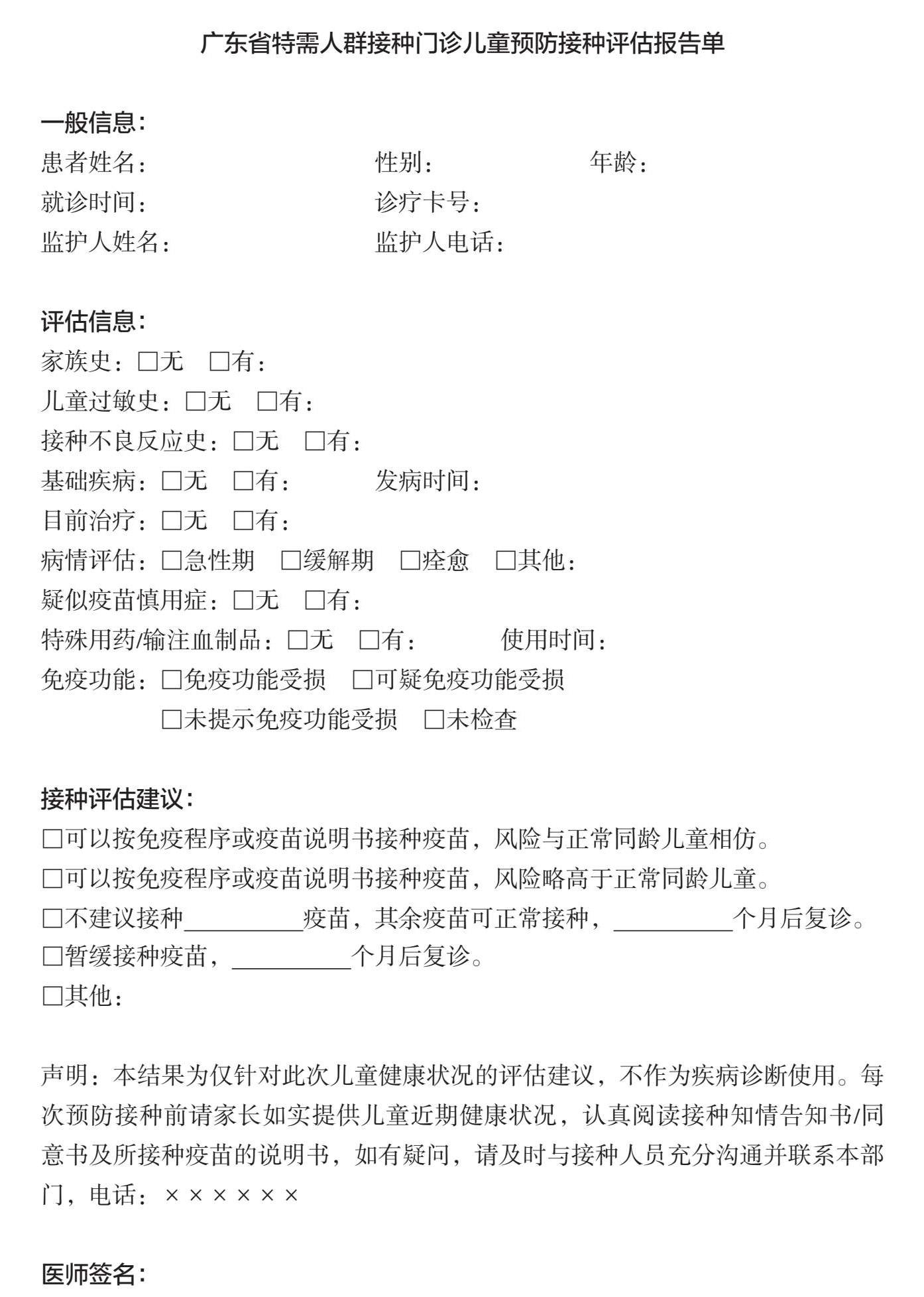 特需人群经过报到—候诊—就诊评估的流程,获得接种评估报告单。医学接种建议分为:①可以按免疫程序或疫苗说明书接种疫苗,风险与正常同龄儿童相仿;②可以按免疫程序或疫苗说明书接种疫苗,风险略高于正常同龄儿童;③不建议接种______疫苗,其余疫苗可正常接种,______个月后复诊;④暂缓接种疫苗,______个月后复诊(图2-2)。
