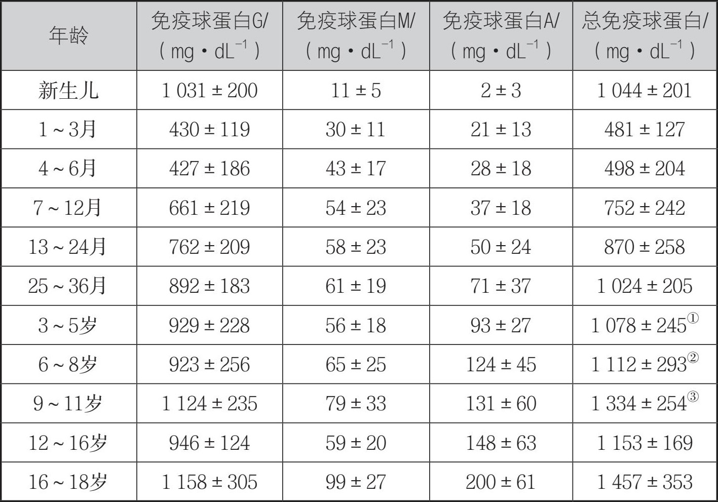 表2-1 正常儿童各年龄段血清中的免疫球蛋白参考范围