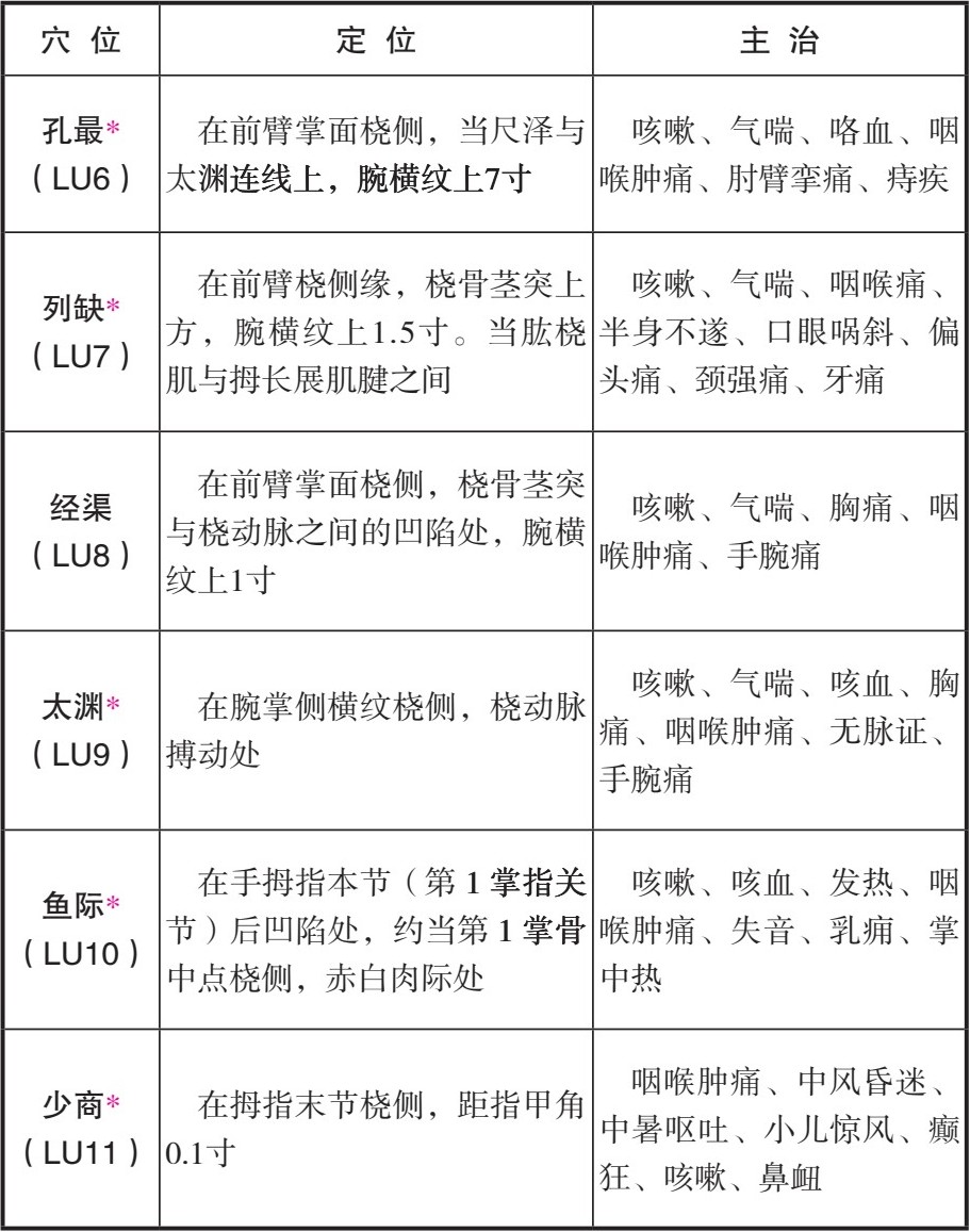 【记忆小结 1】手太阴肺经穴位一览(如表2-2)。
