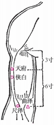 [定位] 在臂内侧面,肱二头肌桡侧缘,腋前横纹头下4寸,或肘横纹上5寸处(如图2-4)。