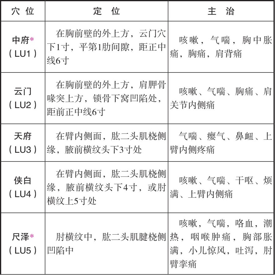 (2)手太阴肺经穴位主治概要: