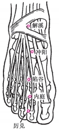 [定位] 在足背,当第2、第3跖骨结合部前方凹陷处(如图2-21)。