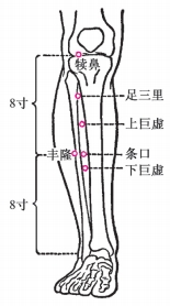 [定位] 在小腿前外侧,当犊鼻下6寸,距胫骨前缘一横指(中指)(如图2-20)。