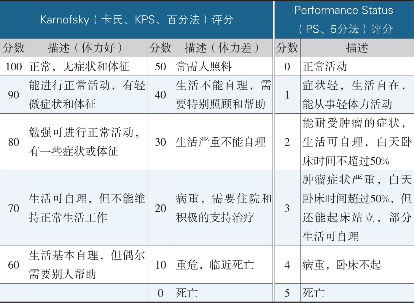 (2)体力状况评分。评分方法有两种(表1):Karnofsky评分和Performance Status评分。健康状况越好,越能忍受治疗给身体带来的副作用,因而也就有可能接受彻底的治疗。反之则许多有效的抗肿瘤治疗无法实施。