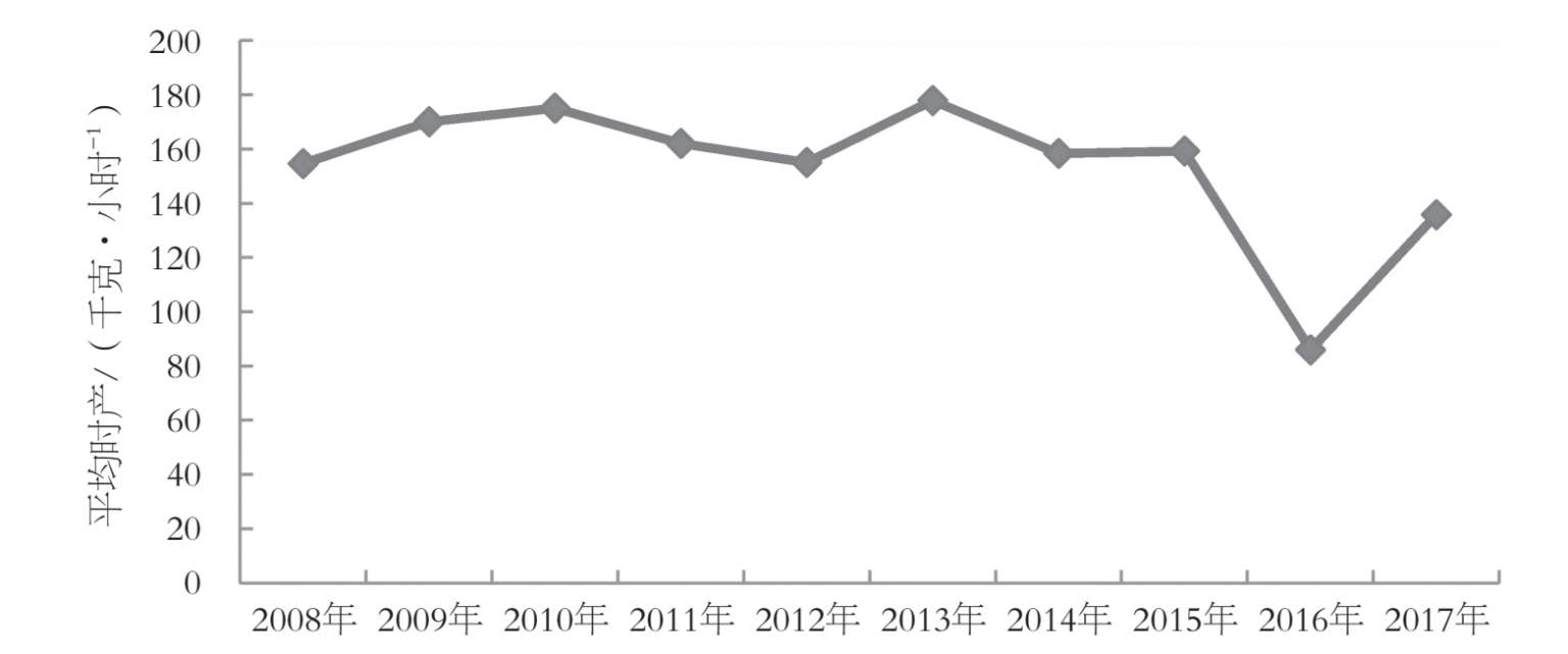 图1-18 2008—2017年广州海洋双拖监测渔船平均时产年际变化