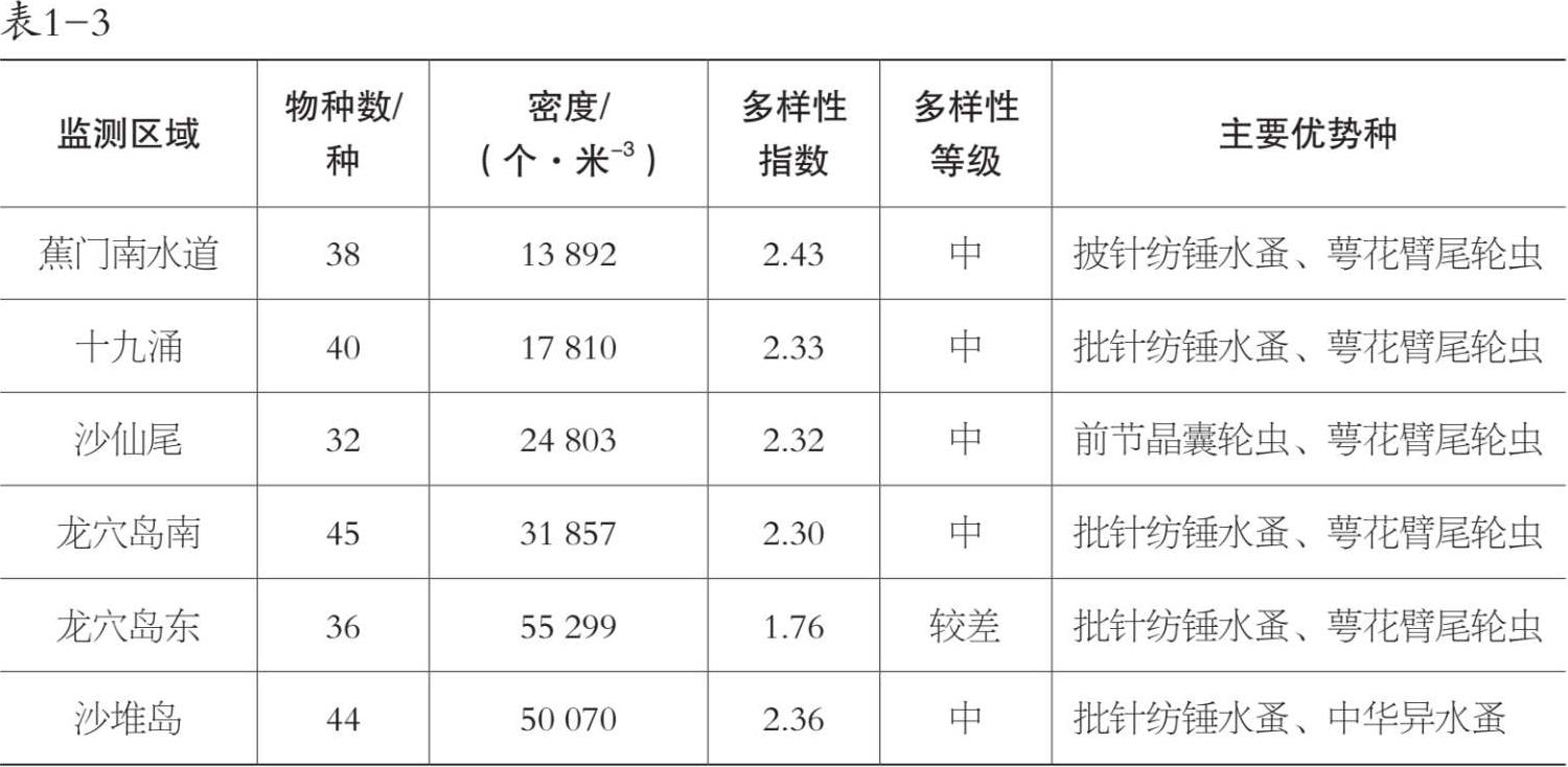 2015年3月、5月、8月、10月在广州海域布设6个站位对广州海域浮游生物的种类组成和数量分布进行了监测,当年共鉴定出浮游动物75种,主要类群为桡足类、轮虫类和枝角类。各站位多样性指数年平均变化范围为1.76~2.43,龙穴岛东的浮游动物多样性指数等级为较差,其他监测站位的浮游动物多样性指数等级为中,2015年广州海域浮游动物监测结果详见表1-3。