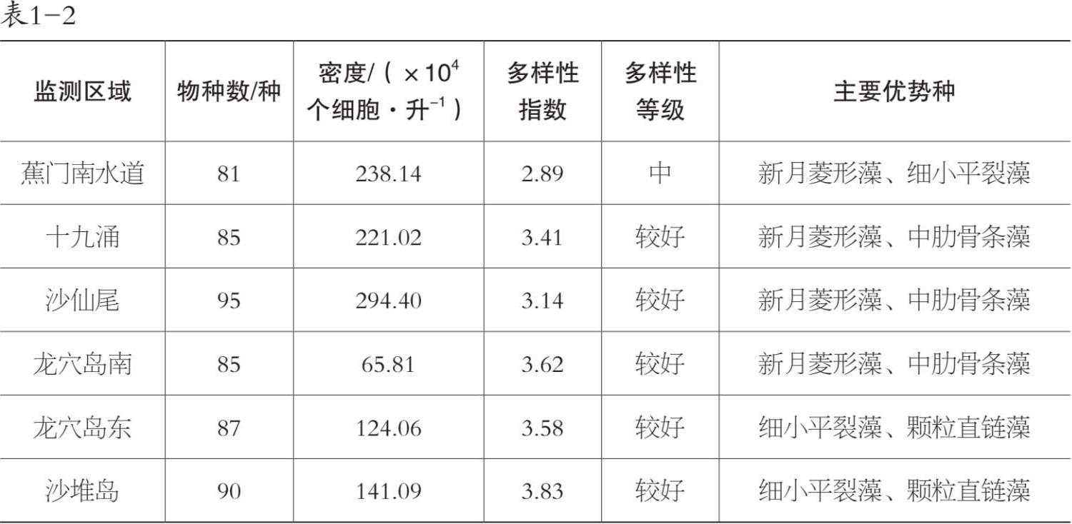 2015年3月、5月、8月、10月在广州海域布设了6个站位对广州海域浮游生物的种类组成和数量分布进行了监测,当年共鉴定出浮游植物183种,主要类群为硅藻和绿藻。各站位多样性指数年平均变化范围为2.89~3.83,蕉门南水道的浮游植物多样性指数等级为中,其他监测站位的浮游植物多样性指数等级为较好,2015年广州海域浮游植物监测结果详见表1-2。