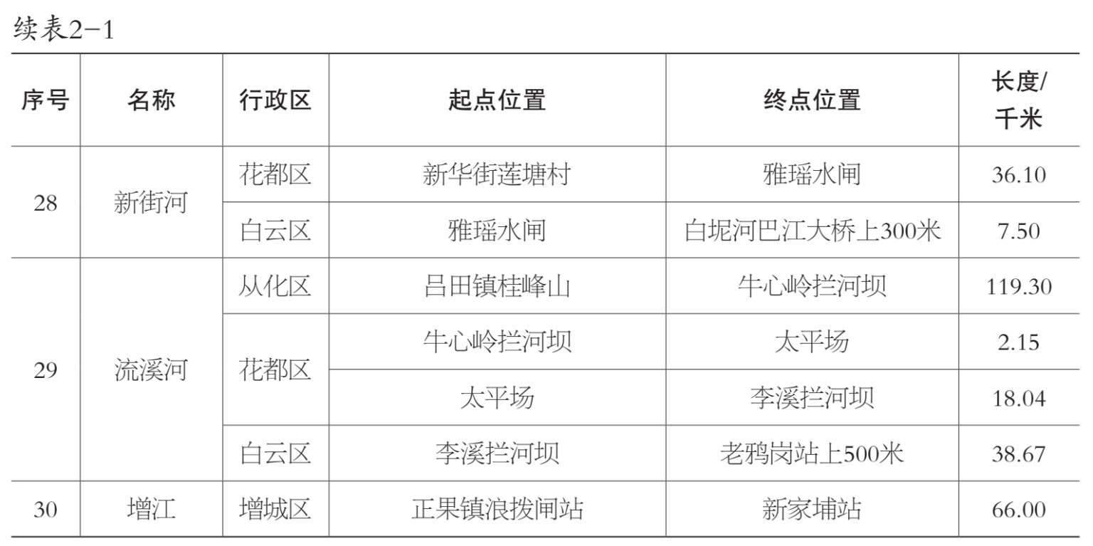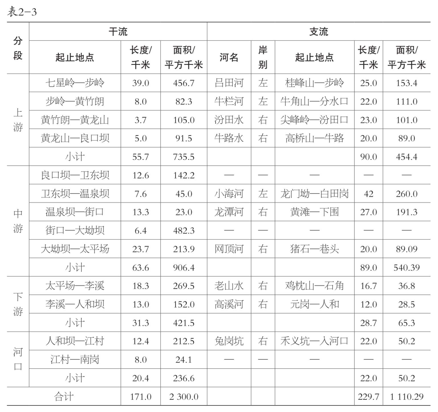 东江北干流 东江流至石龙以下分为两支:东江北干流经石龙北向西流至新家埔纳增江,至白鹤洲转向西南,流入狮子洋,全长42千米;另一支为东江南支流,从石龙以南向西南流经石碣、东莞,在大王洲接东莞水道,最后在东莞洲仔围流入狮子洋。除东江北干流右岸位于广州市境内外,其余均位于东莞市境内。东江北干流北岸在增城境内,与东莞市相望,地形为平原,流域内地势北高南低,是增城区主要航道。东江北干流水深河宽坡降缓,便于通航,沿岸各镇水运交通发达,新塘镇以下可通航千吨级轮船,300吨级轮船可达增江口。东江北干流在增城区境内流程29.84千米,流域多年平均降水量1 630毫米,大部分集中在4—9月份。降水量产生径流量大,地表、地下水资源丰富,流域年径流深1 134毫米,东江北干流过境客水150.8亿立方米,过境客水是稳定的重要水源。在广州市境内直接汇入东江北干流的支流主要有增江、西福河、雅瑶河、兰溪水和官湖河,均由北向南注入东江。主要的二级支流有派潭河、二龙河及金坑河等(表2-1、表2-2、表2-3)。