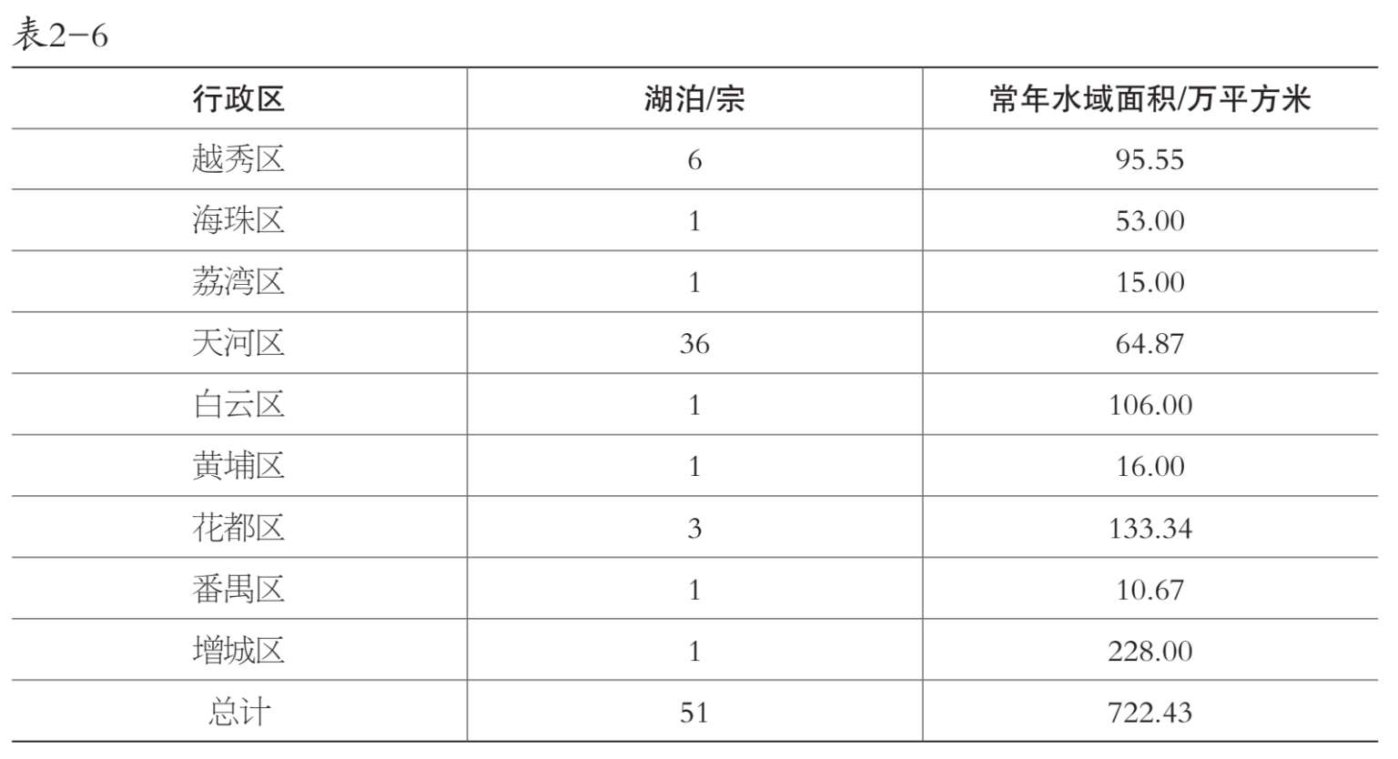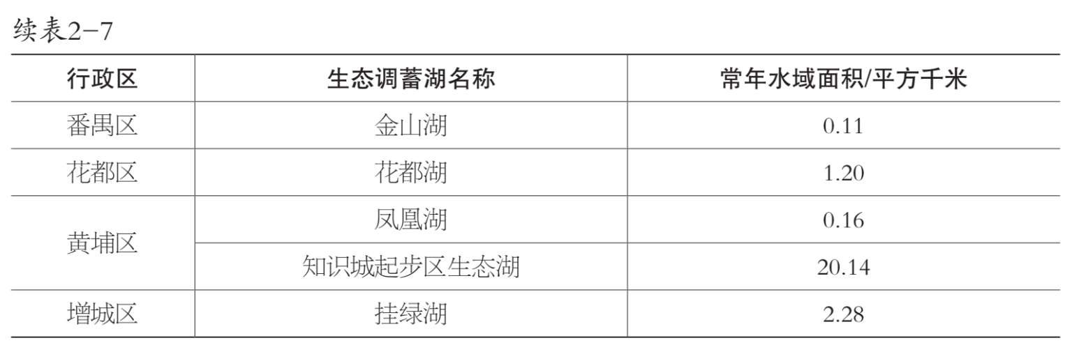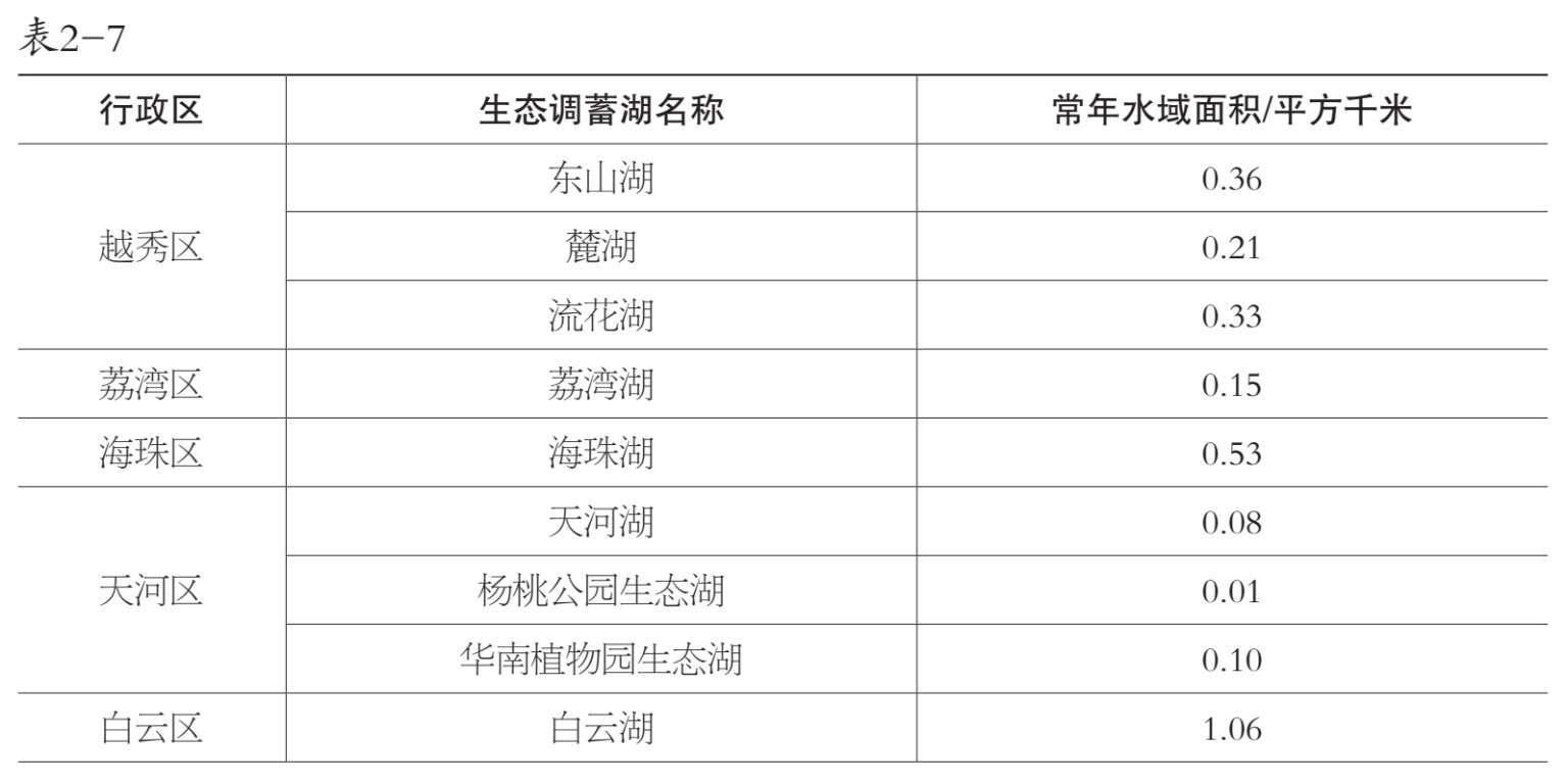 广州市现有湖泊51宗,其中生态调蓄湖14宗,即东山湖、麓湖、流花湖、荔湾湖、海珠湖、天河湖、华南植物园生态湖、杨桃公园生态湖、白云湖、金山湖、花都湖、凤凰湖、知识城起步区生态湖、挂绿湖,总常年水域面积约为722.43万平方米。人工调蓄湖除具有生态景观、休闲娱乐功能外,还兼顾着雨洪调蓄、防洪减灾的作用(表2-6、表2-7)。