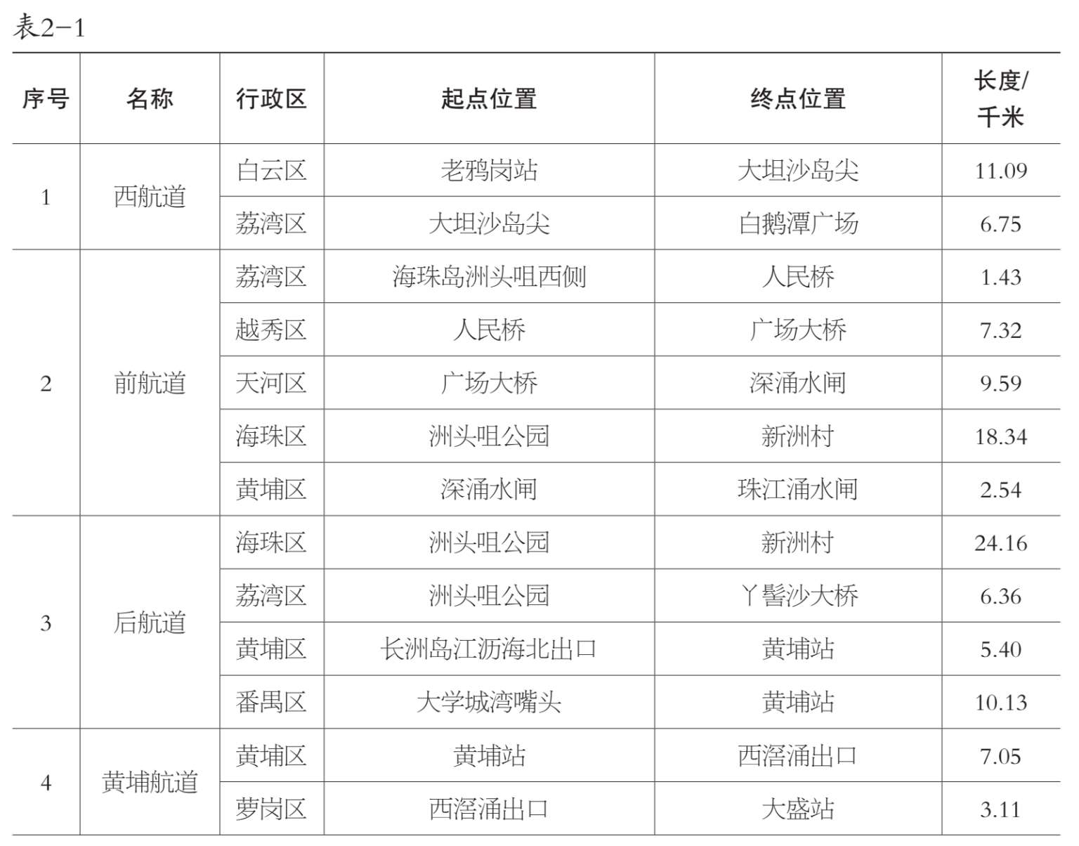 注:1.前航道在海珠区段,左岸荔湾区、越秀区、天河区,右岸海珠区,合计长度不统计。2.后航道在荔湾区段,左岸海珠区,右岸荔湾区,合计长度不统计。3.后航道在黄埔区段,左岸海珠区,右岸黄埔区,合计长度不统计。