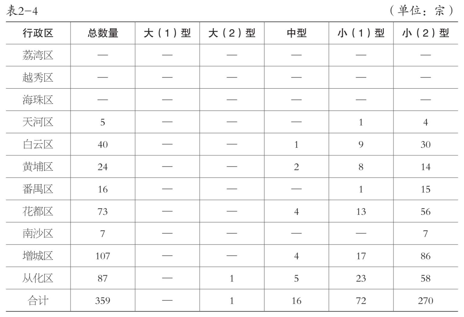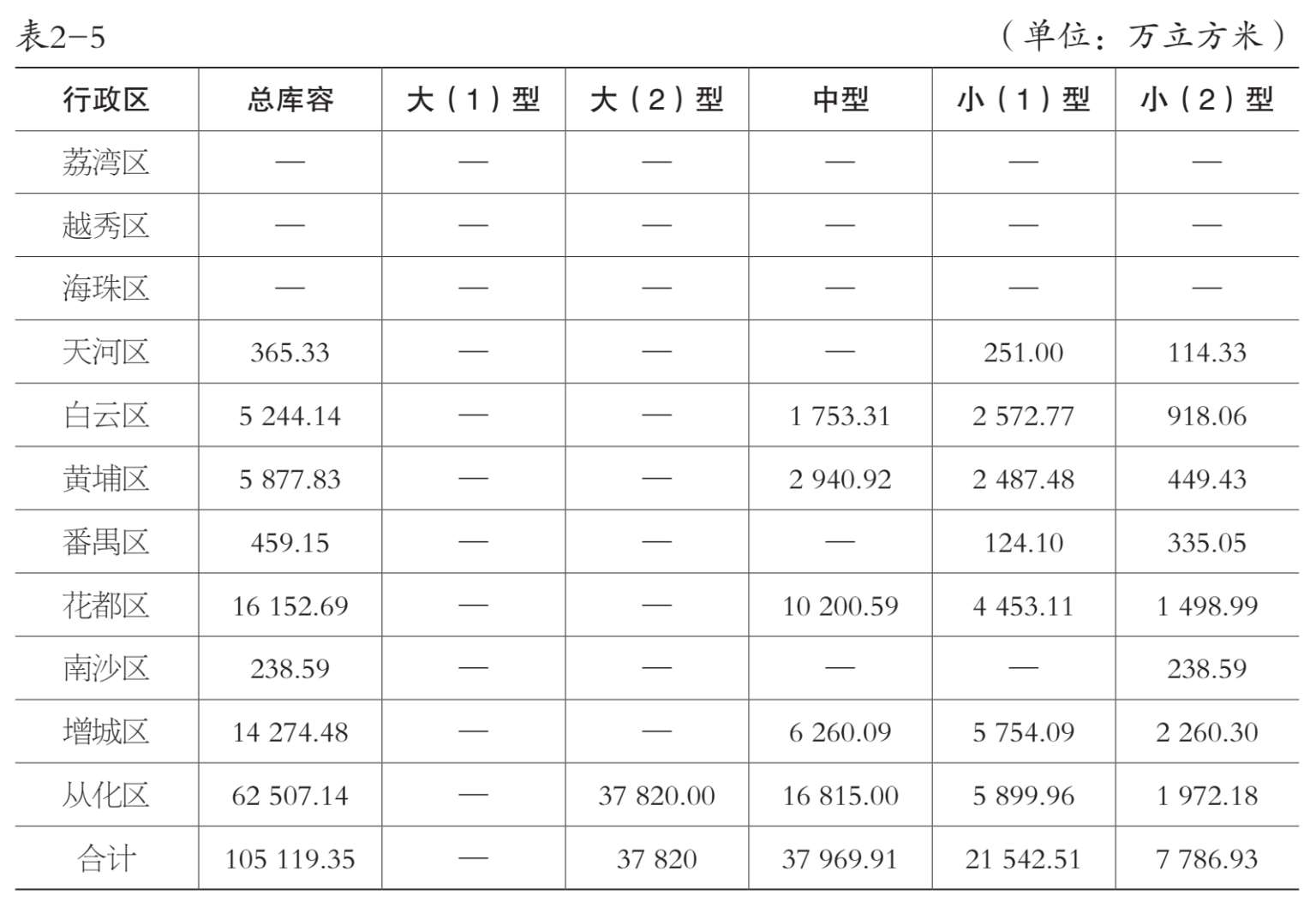 2017年全市水库共计359座,其中,大型1宗,中型16宗,小型342宗;总库容10.51亿立方米。水库工程集中分布在花都区、增城区和从化区,这3个区中又以增城区水库数量最多,共计107座,占全市的29.8%。荔湾区、越秀区、海珠区无水库工程(表2-4、表2-5)。