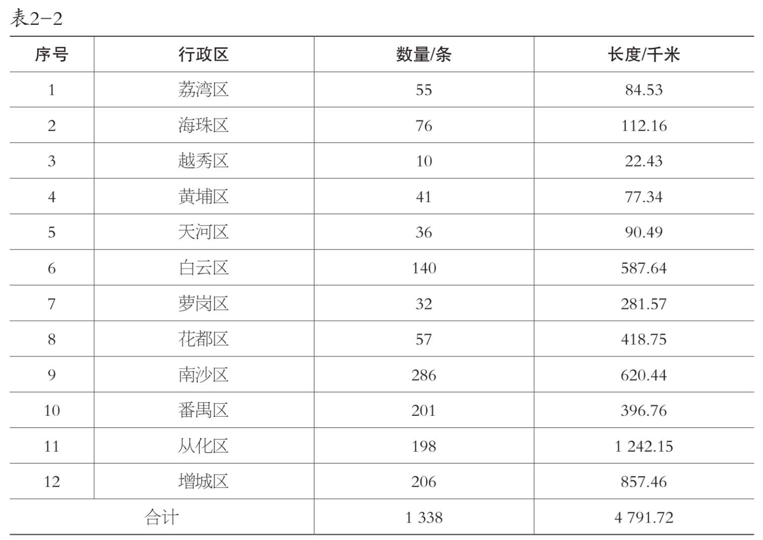 广州市大小河流(涌)众多,河宽5米以上的河流(涌)1 368条,总长5 597.36千米,河道密度达到0.75千米/平方千米。其中,骨干河道30条(包括西航道、前航道、后航道、黄埔航道),总长805.64千米;一般河道(涌)1 338条,总长4 791.72千米。