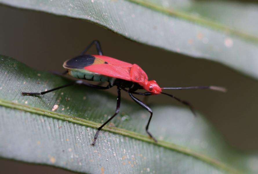 头、前胸背板、前翅赫红色。小盾片黑色。革片中央具一椭圆形大黑斑,连为一体。触角4节,黑色。