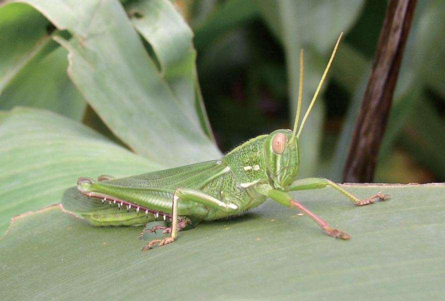 体纯绿色,面部及前胸具少量淡色条纹,后足胫节淡红色具白色大刺。