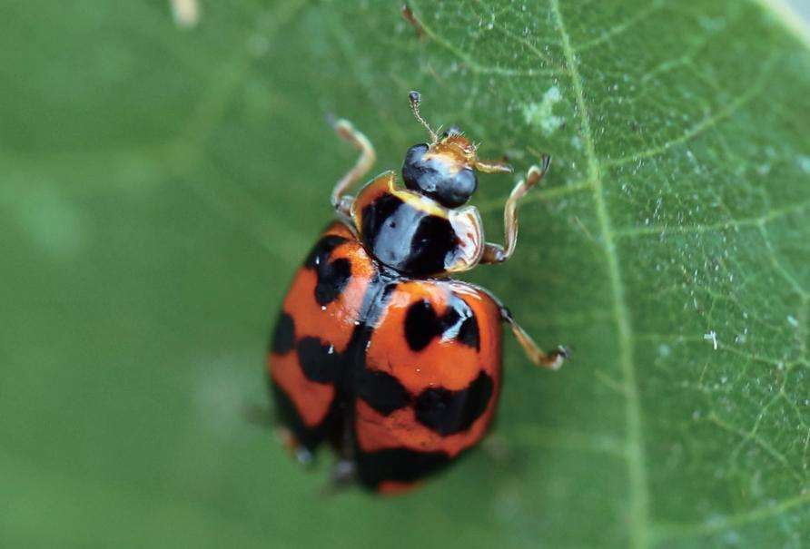 体卵圆形,背面拱起,无毛。前胸背板黄褐色,具黑斑。鞘翅黄色,有黑斑。