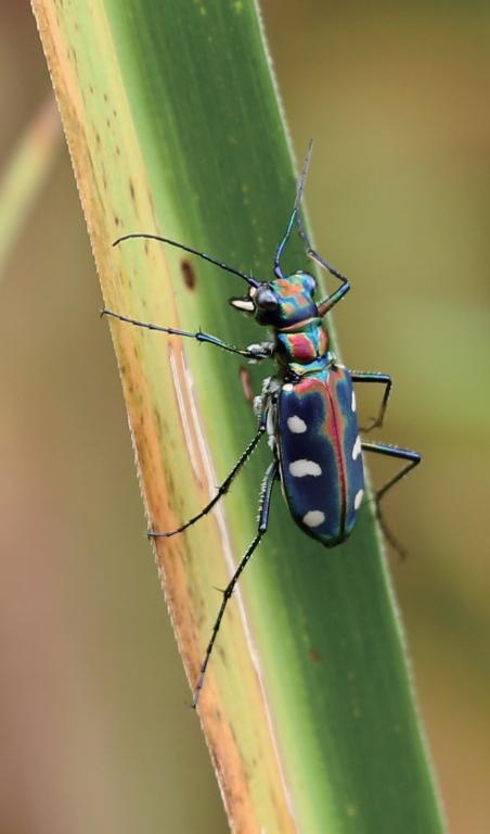 体暗铜色略带绿色光泽。鞘翅沿翅缘各具4个白斑。