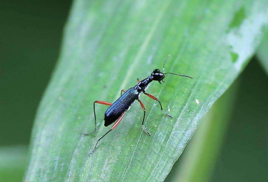 体具蓝绿色光泽,腿节黄色至橙红色。前胸细长,鞘翅狭长,前胸及鞘翅被细毛。