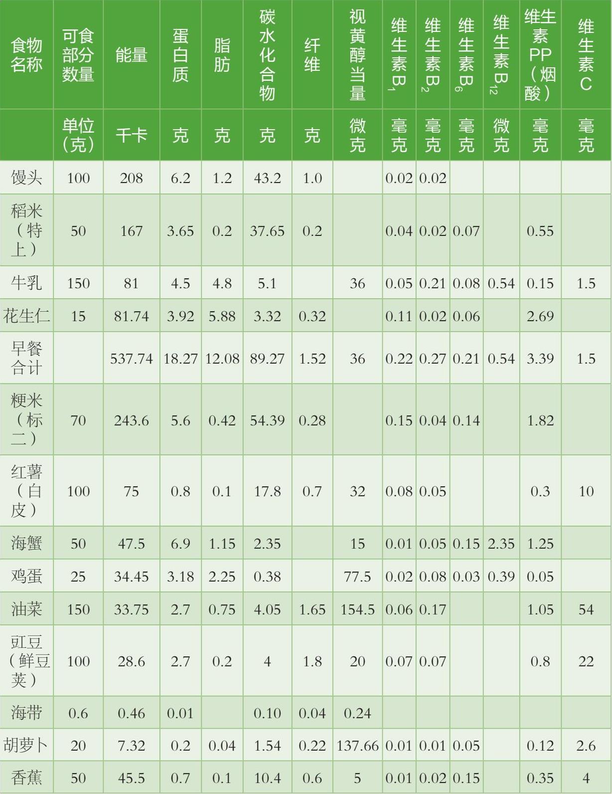 早餐:早餐能量占全日总能量的25%~30%,即7.531兆焦×25%(1800千卡×25%)~7.531兆焦×30%(1800千卡×30%)=1.882兆焦(450千卡)~2.259兆焦(540千卡)。