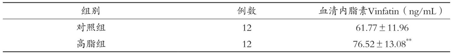 表 2 6周末高脂组大鼠血清内脂素及相关指标与对照组的比较
