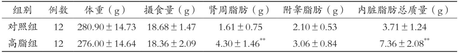 表3 6周末高脂组大鼠摄食量、体重及内脏脂肪总质量与对照组的比较