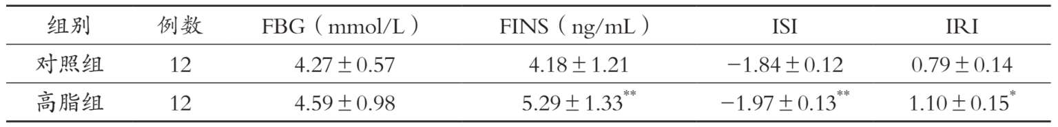 表1 6周末高脂组大鼠胰岛素抵抗相关指标与对照组比较