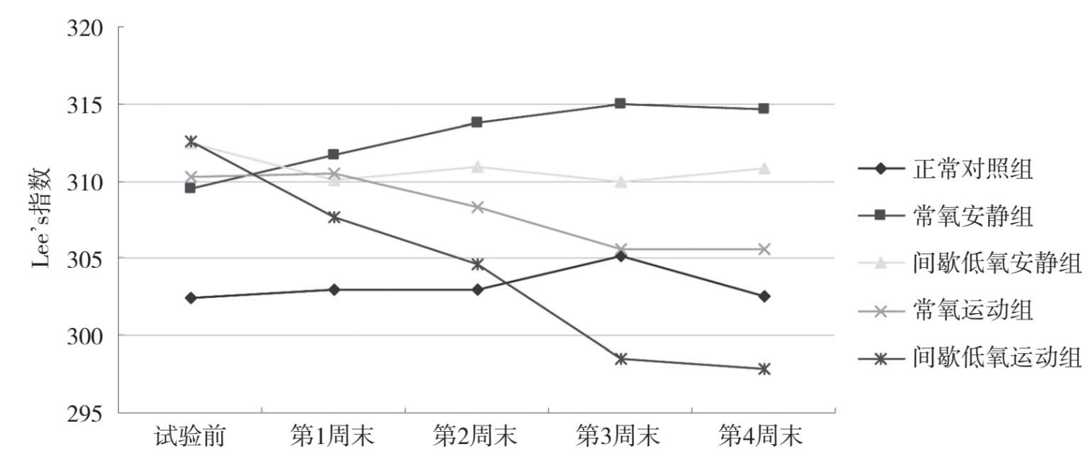 从大鼠的Lee’s指数变化来看,经过4周间歇低氧运动后,四组大鼠的Lee’s指数变化规律是间歇低氧运动组<常氧运动组<间歇低氧安静组<常氧安静组。