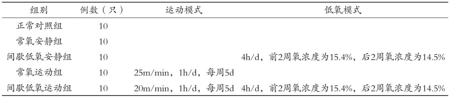 对肥胖大鼠进行4周间歇低氧运动干预(按表2方案进行)。实验中采用美国Hypoxico公司制造的低氧分压系统(HTS)造成人工的常压低氧环境。动物跑台为杭州立泰科技有限公司生产的BCPT-98型电动动物跑台。