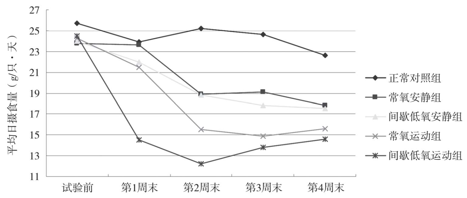 间歇低氧运动抑制了大鼠食欲,减少了大鼠的每日摄食量,从而导致大鼠的能量摄入减少,减缓了大鼠体重的增加。提示了间歇低氧运动可以起到减控体重的效果,并且比单纯的运动效果更好。
