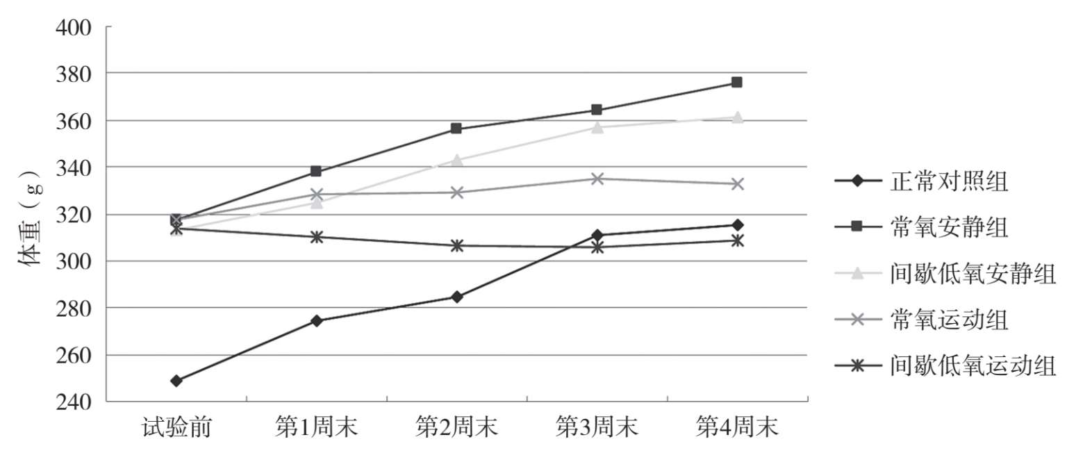 低氧环境可激活HIF-1,其激活后可转录调节下游的肾上腺髓质和酪氨酸羟化酶(儿茶酚胺生物合成中的限速酶,调节体内儿茶酚胺的生成)编码基因,促进肾上腺素和去甲肾上腺素的分泌,从而提高机体的基础代谢率,增加机体的能量消耗。运动锻炼不仅增加了机体运动过程中的能量消耗,而且提高了机体运动后一段时间的安静代谢率,使运动后一段时间的能耗增加。低氧运动时机体受到低氧和运动的双重负荷刺激,此时机体的能量消耗增加;同时,低氧运动可以通过多种途径来抑制大鼠食欲,减少大鼠的日摄食量;这样低氧运动就引起能量消耗的增加和能量摄入的减少,结果导致机体出现能量负平衡,使体重下降。间歇低氧运动降低大鼠体重还可能与低氧环境降低大鼠的消化吸收功能有关。本研究结果也表明这一点,这与众多的高原训练和低氧运动实验结果相同。