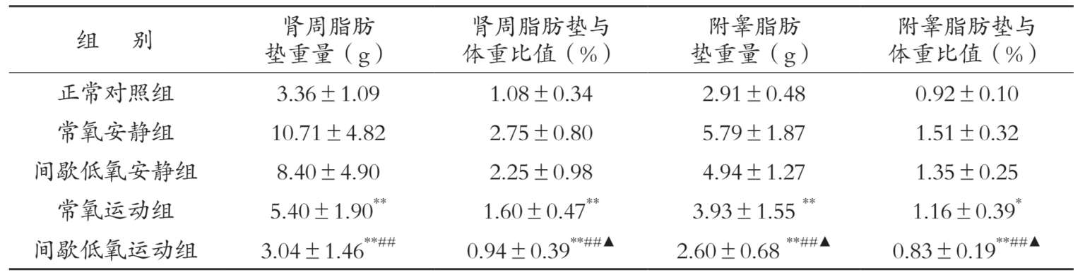 表5 4周间歇低氧运动后大鼠肾周脂肪垫和附睾脂肪垫的变化情况表