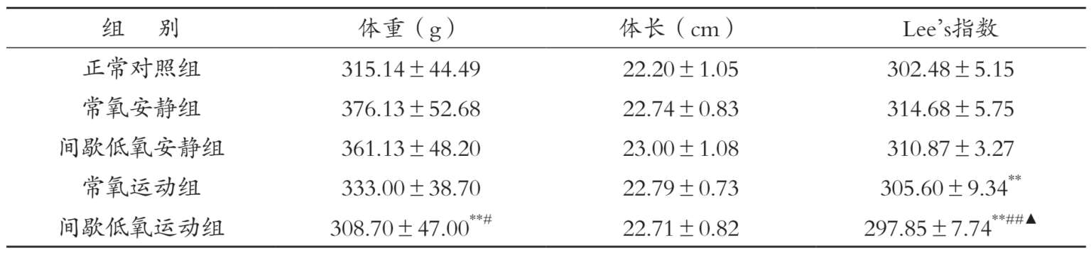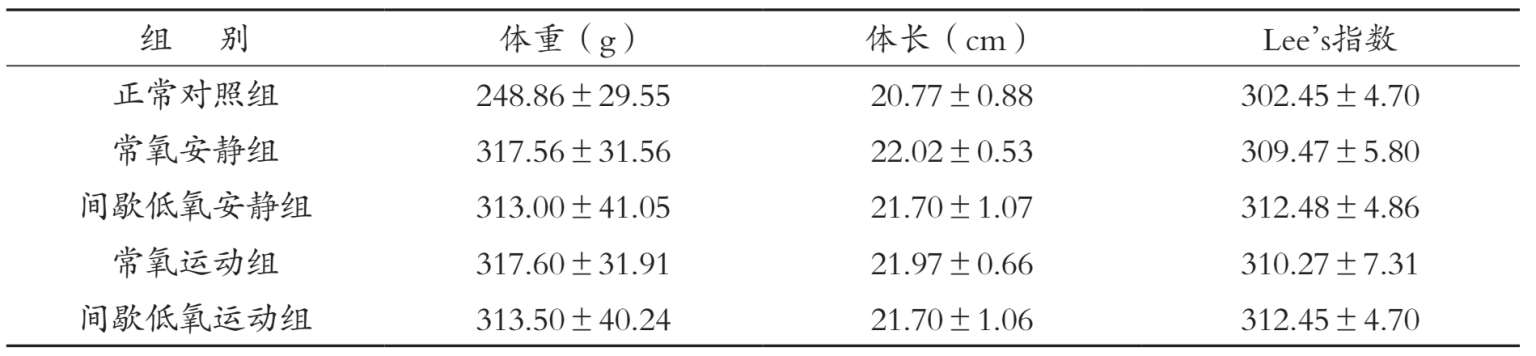 表4 4周间歇低氧运动后各组大鼠的体重、体长及Lee’s指数