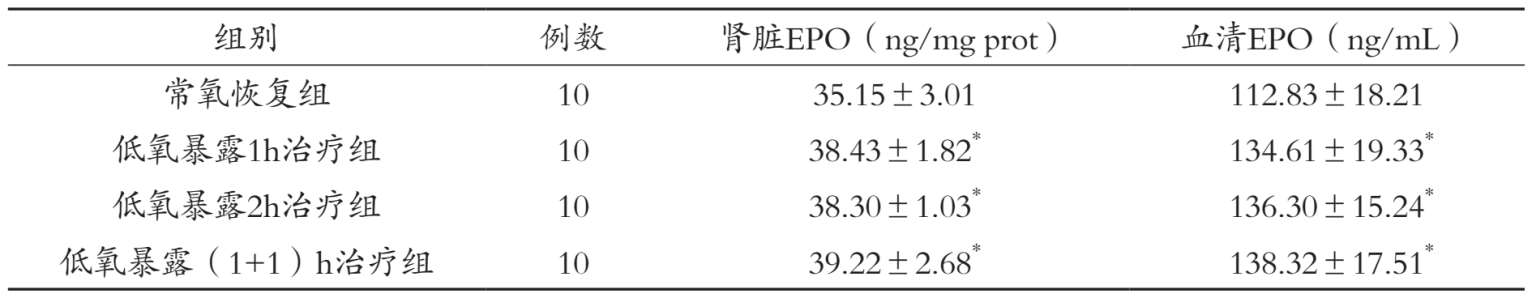 表3 安静对照组和间歇低氧暴露治疗各组大鼠肾脏、血清EPO比较