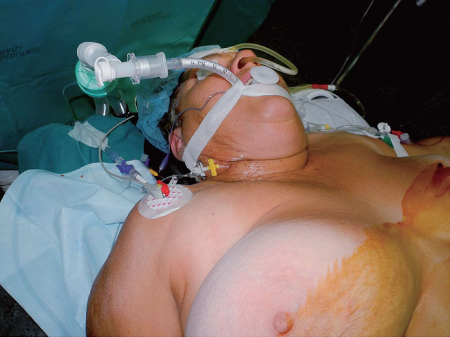 图1-4 在手术室留置中心静脉导管(CVC),便于术中补液和术后肠外营养输注。