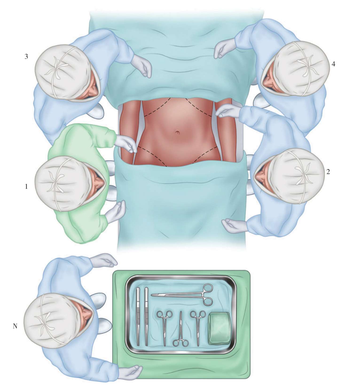 图1-5 手术组成员站位:术者(着绿色衣服者,1)站于患者的右侧,第一助手(2)位于术者对侧,另两名助手分别站于术者左侧(3)和第一助手(4)右侧,洗手护士(N)站于术者的右侧。