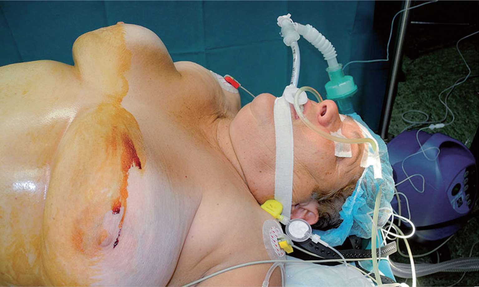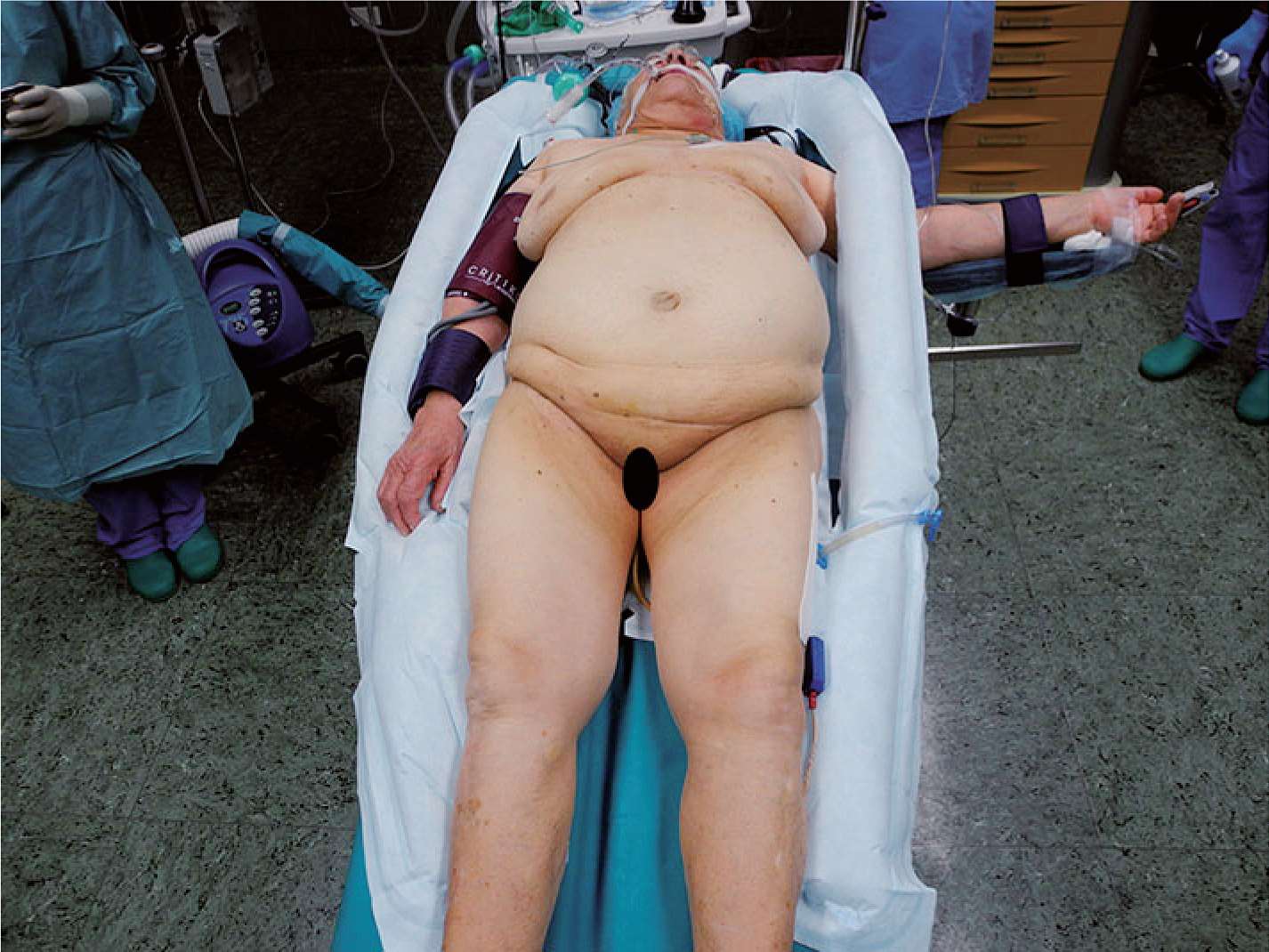 图1-1 患者取平卧位,按麻醉师要求左上肢外展,右上肢内收,放于身体一侧,便于术者及助手站位。患者身下放置加热毯。麻醉成功后,留置导尿管及鼻胃管。在将患者移至手术室之前,用电动理发推子将体毛剪除,其范围:上界达两乳房连线,下界达耻骨连线,外侧界达腋中线。