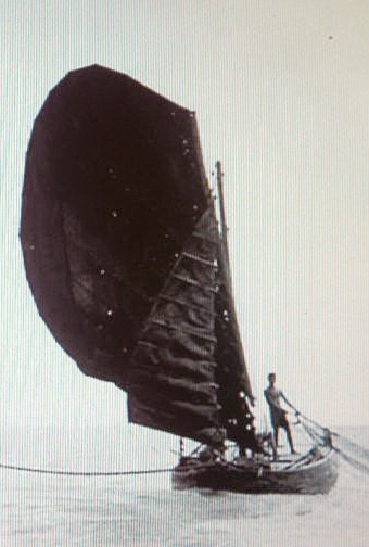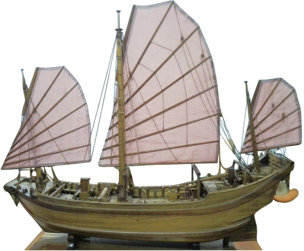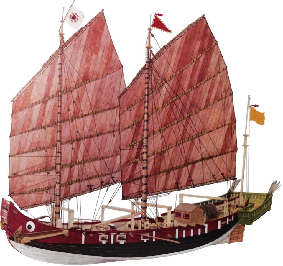 这艘大兵船,帆是广东式,主体和舵(开孔舵)也是广东式,尖首,圆尾。有风用帆,无风用橹。
