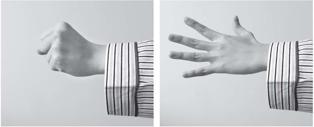 (1)握拳伸指运动(图6-2)用力握拳,然后用力伸指。初始3组/天,每组5~10min,以后逐渐增加次数和延长时间。