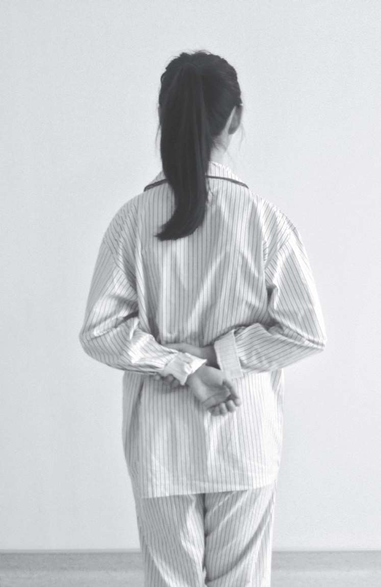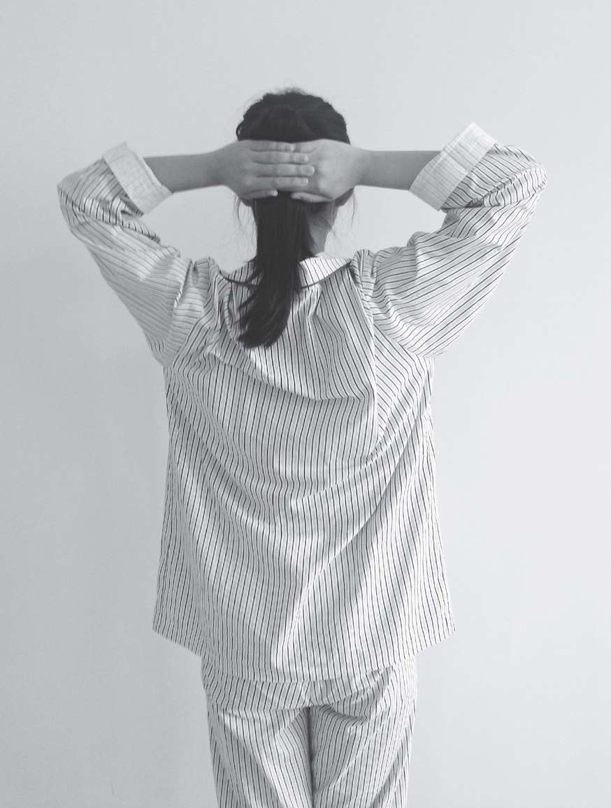 (3)肩外展练习 患者双手抱头,使双肩外展、外旋。每天3次,每次各20~30下(图10-6)。