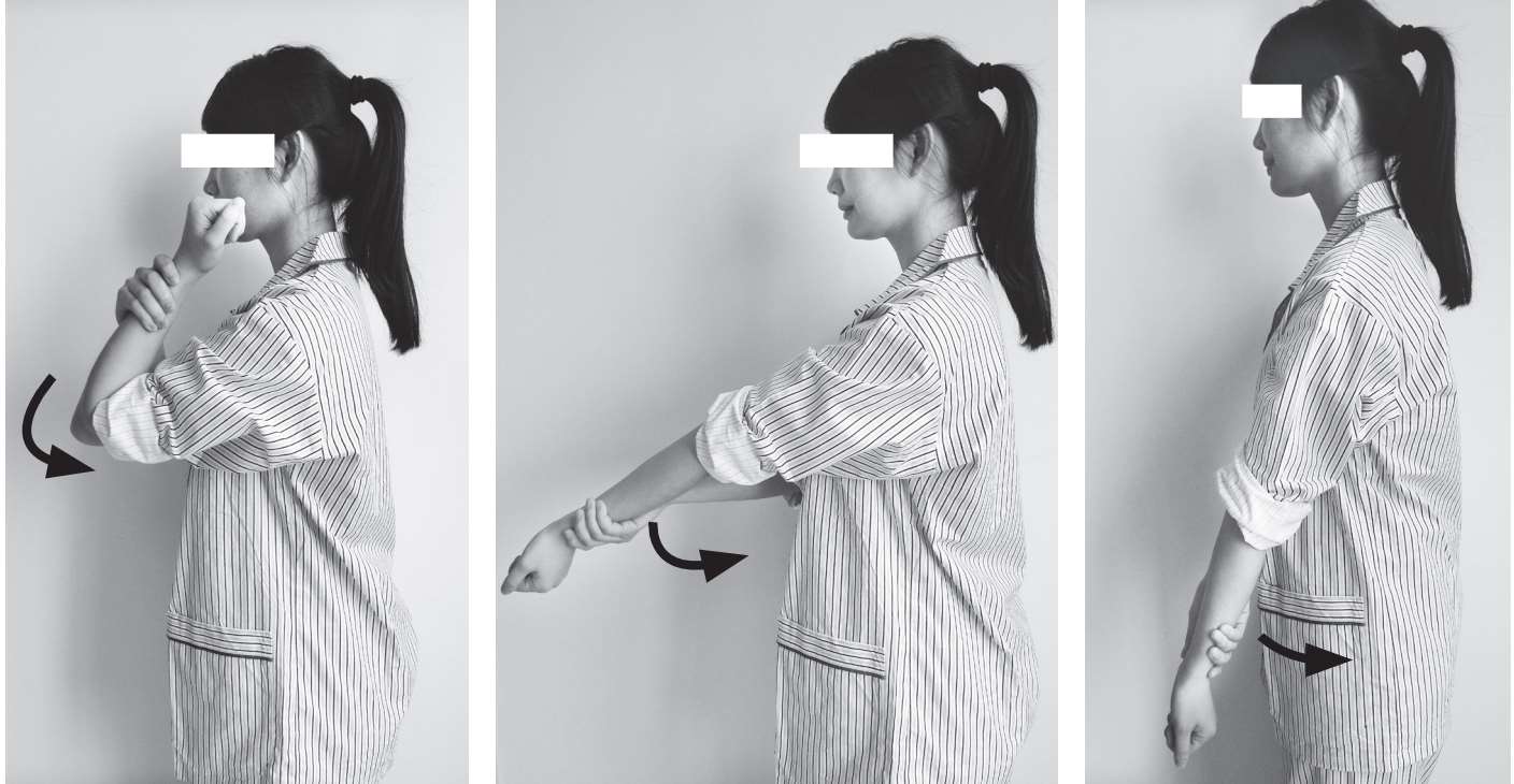 (2)肩内旋练习 患者用手摸腰背部,使肩关节内旋。每天3次,每次20~30下(图10-5)。