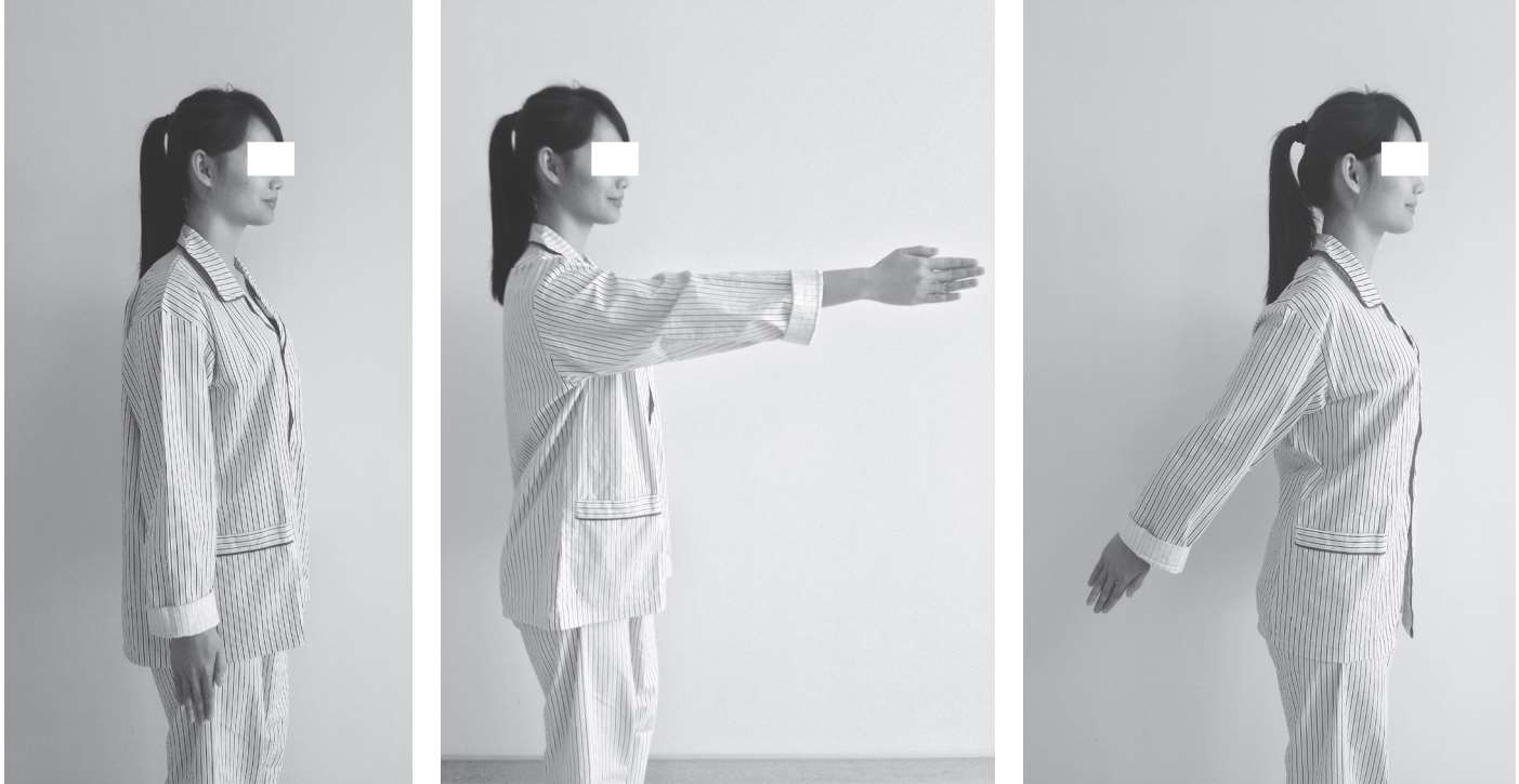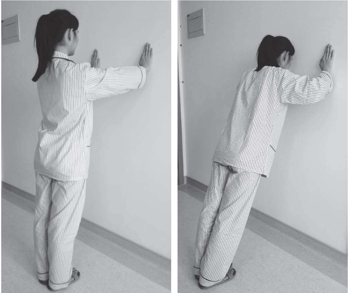 (1)肩关节前屈、后伸练习 上臂与地面垂直,做钟摆样前后运动,范围由小逐渐增大。每天3次,每次20~30下(图10-4)。