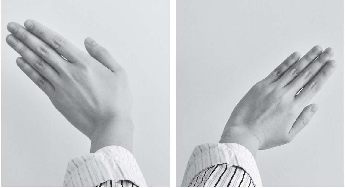 4.腕关节活动3~4周后经X线照片骨折已临床愈合、可拆除外固定,可做腕关节的康复锻炼。方法:双腕关节屈伸练习(图10-8),腕关节尺、桡偏练习(图10-9)以及推墙练习(图10-10)等。以上动作各持续5下,每天4次,每次3~5min。
