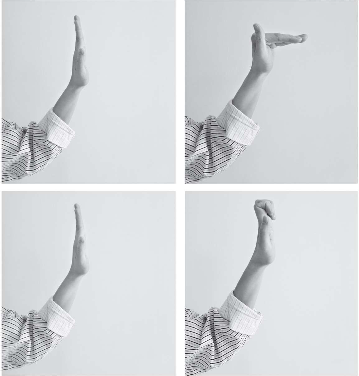 (2)屈指90°及虎爪练习 将食指、中指、无名指、小指分别屈曲至90°及屈曲成虎爪位,持续10s然后放松。重复做3~5min,每天做3~4次(图10-3)。