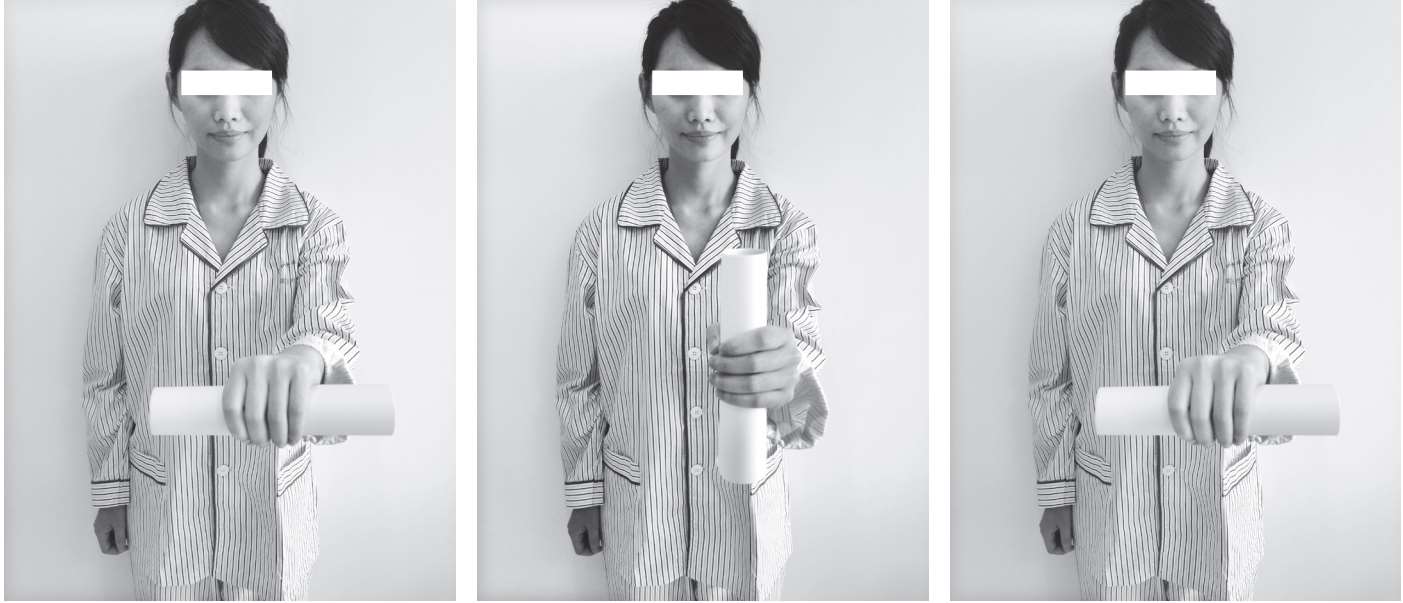 5.前臂旋转活动 术后4周内禁止做旋前、旋后动作,生活上也避免做拧毛巾、拧螺丝钉等动作。4周后开始做前臂旋转活动,初始范围0°~20°。每天3~5次,每次5min,每天增加10°(图10-11)。