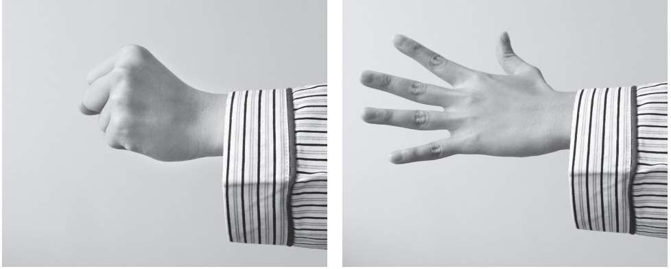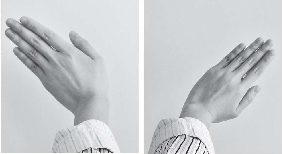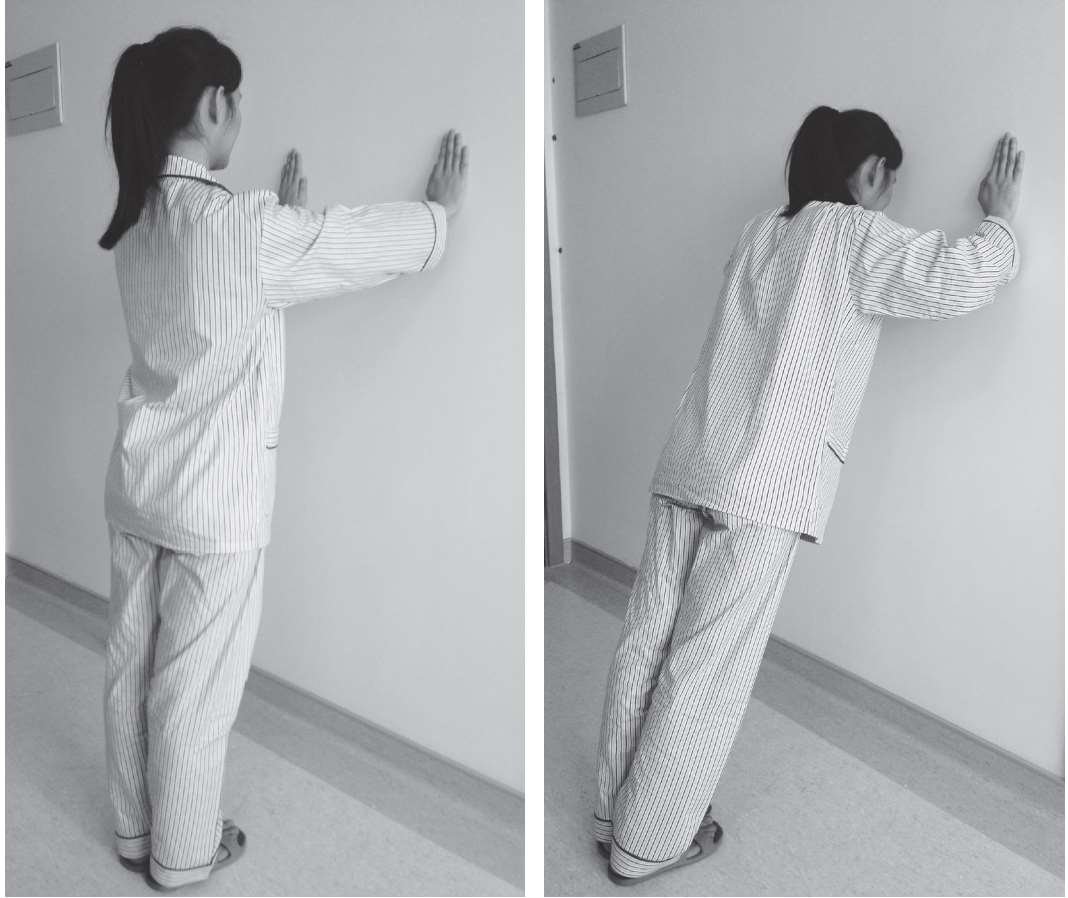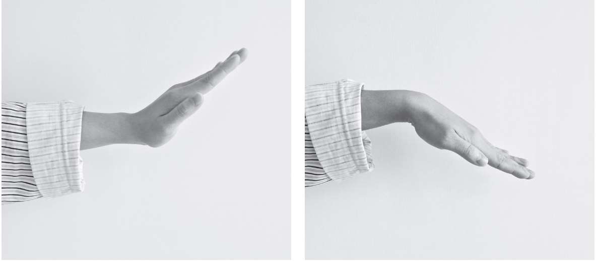 4.3~4周后 解除外固定,充分练习腕关节的屈伸、旋转活动和尺桡侧偏斜活动。腕关节的功能是手的各种精细活动的基础,如腕关节功能恢复不良,会给生活带来很多麻烦,因此作为患者要特别重视。利用健手帮助患侧腕部练习,是一种简便而有效的方法。如以两手掌相对练习腕背伸,两手背相对掌屈。也可利用墙壁或桌面练习背伸和掌屈(图11-11)。