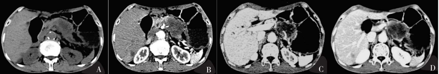 图8-2A、图8-3A平扫期:胰体尾正常形态消失,呈局限性增大,病灶平扫呈不均匀低密度改变,边界较清楚;图8-2B:病灶强化不明显,在周围正常强化胰腺实质对比下呈不均匀低密度,胰周动脉强化,其中图8-2B显示病灶包容肠系膜上动脉及脾动脉;图8-2C门静脉期:病灶边缘呈轻度不均匀强化,与周围胰腺实质相比仍呈低强化,门静脉、肠系膜上静脉及脾静脉强化;图8-2D延迟期:病灶仍呈低强化。
